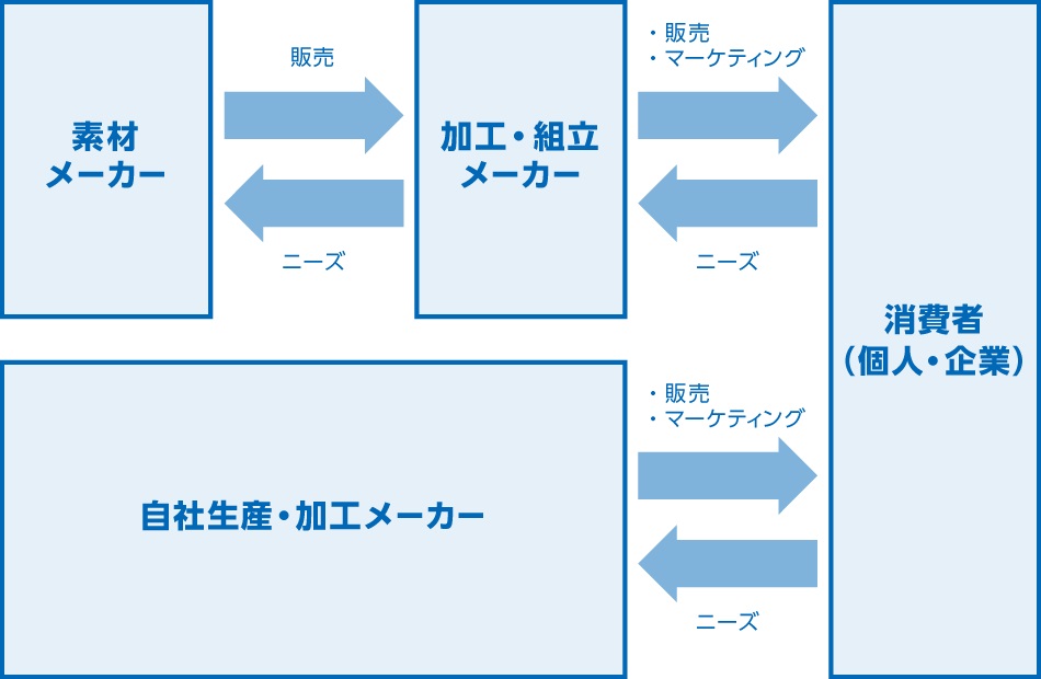 メーカーは、企業規模や製品によって、素材の加工から組み立てまで全工程を自社で行う企業もあれば、素材の加工、組み立てなど、一部だけを担う企業もある。